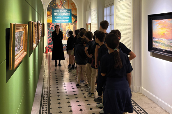 6. sınıf öğrencilerimizle birlikte sanat gezimizi gerçekleştirerek Arkas Sanat Galerisinin düzenlediği “Gelenek ve Modernite: Arkas Koleksiyonu’nda Türk Resmi” sergisini ziyaret ettik. ✨ Türk resim sanatının Osmanlı’dan Cumhuriyet’e uzanan modernleşme yolculuğunu anlatan sergide, öğrencilerimiz İzlenimcilik ve Kübizm gibi akımların Türk resmine nasıl yansıdığını inceleyerek dönemin sanatçılarının modernleşme ile gelenek arasında kurduğu dengeyi keşfettiler. Manzara ve figür resimleri üzerinden şehir hayatının, kültürün ve modern bireyin değişimini gözlemlediler. 1914 Kuşağı sanatçıları ve D Grubu sanatçıları gibi birçok önemli ismin eserleriyle karşılaşan öğrencilerimiz, Türk sanat tarihine dair zengin ve ilham verici bir deneyim yaşadı. Bu verimli gezide öğrencilerimiz hem sanat bilgilerini geliştirdi hem de geçmişten günümüze uzanan yaratıcı ifade biçimlerini yakından tanıma fırsatı buldu.
