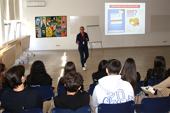 Bornova İlçe Sağlık Müdürlüğü 9. sınıf öğrencilerimiz için okulumuzda Organ ve Doku Bağışı Sunumu gerçekleştirdi. Sunum kapsamında, organ ve doku bağış süreçlerine dair temel bilgiler ve örnekler paylaşılırken, toplumsal farkındalığın artırılması hedeflendi. Etkinlik, öğrencilerimizin sağlık bilinci ve sosyal sorumluluk konularında düşünmelerine katkı sağladı.