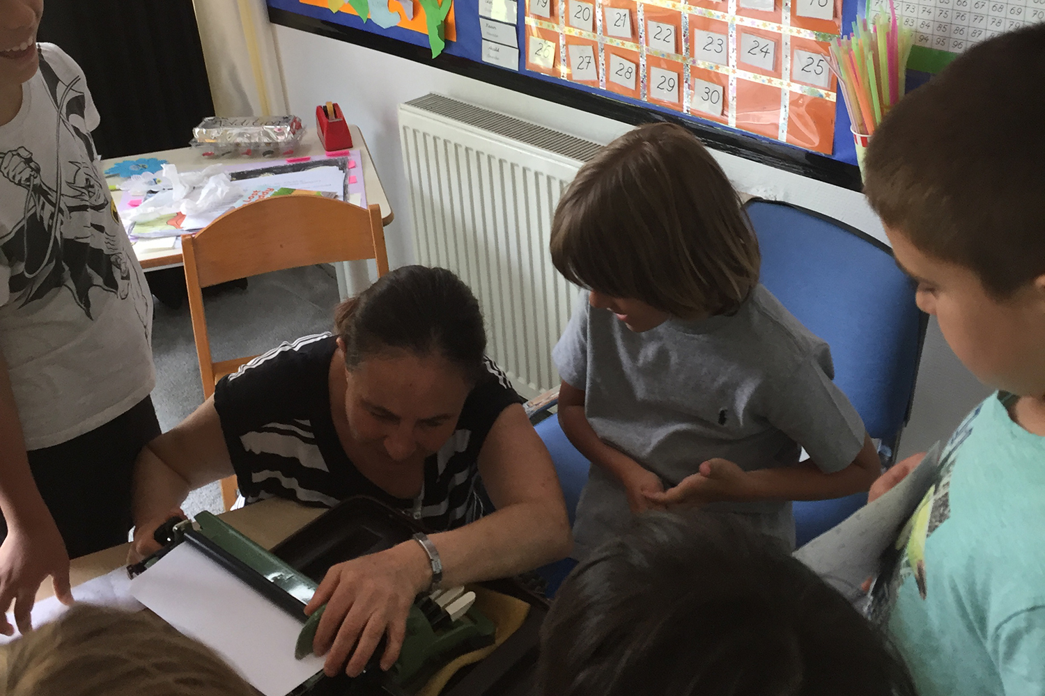 1. sınıflarımız “Kendimizi İfade Etme Yollarımız” ünitesi çerçevesinde Hatice Önder’i sınıflarında ağırladılar. Konuğumuz Hatice Önder öğrencilerimize görme engelli insanların kendilerini hangi yollarla ifade ettiklerini anlattı. Bizlere Braille alfabesini tanıttı. Yanında getirdiği makinasıyla öğrencilerimize nasıl yazı yazıldığını gösterdi. Öğrencilerimiz braille ile kendi isimlerini yazmayı deneyimlediler. Ayrıca Sayın Önder bizlerle görme engelli bir ressamın yaptığı resimlerden bazı örnekleri paylaştı. Öğrencilerimiz yaşadıkları bu farklı deneyimden büyük keyif aldılar. Bizler de öğrencilerimizin duyarlı davranışlarından dolayı onlarla gurur duyduk.