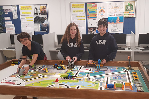Ortaokul I-Robotiks takımımız, 5 Mart Cumartesi günü katıldıkları Ege Bölgesi FLL turnuvasında beş aydır üzerinde çalıştıkları yenilikçi proje sunumu, öz değerler ve robot tanıtımını yaptı. ‘Yenilikçi Proje’ kategorisinde, projemizin çevre duyarlılığı içeriği ve bu konuya değinen tek ekip olmamız nedeniyle takımımız turnuva jürisinin övgü ve takdirini kazandı. Takımımızın Robot ekibi 6 Mart Pazar günü 3. Etap-Robot yarışmasına katıldılar. Takımımızı ve danışman öğretmenlerini başarılı performansları ve özverili çalışmalarından ötürü kutluyoruz.