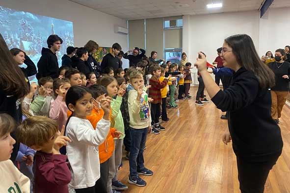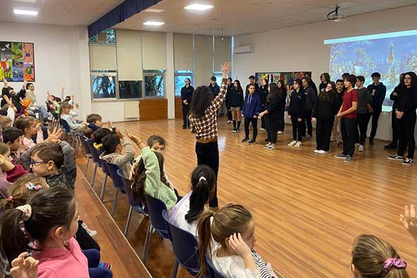 1. sınıf öğrencilerimiz “Kendimizi Düzenleme Biçimimiz” ünitesi kapsamında “İşaret ve semboller hayatımızı düzenlememize yardımcı olur.” ana fikrini çalışıyorlar. Bu bağlamda işaret dilini sorguladılar. İşaret dilinin kullanım alanlarını ve farklı dillerin işaret dilini çalıştılar. Bununla birlikte okulumuz lise bölümü Matematik ve Yarışmalar OSP öğrencileri, dahil oldukları “Sessizliğin Dili” projesinin bir parçalı olarak 1. sınıf öğrencilerimizle küçük tiyatroda bir araya geldiler. Lise öğrencilerimiz işaret diliyle ilgili bilgiler verdikten sonra öğrencilerimize “Yeni Yıl” şarkısını işaret diliyle söylemeyi öğrettiler. Keyifli geçen etkinliğimiz için emeği geçen tüm lise öğrenci, öğretmen ve yönetim ekibine teşekkür ederiz. Öğrencilerimiz de ünitemizin eylemi olarak öğrendikleri bu şarkıyı ilkokuldaki tüm arkadaşlarına söyleyecekler.
