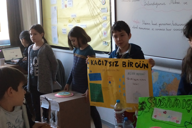 1 adet A4 kağıdının içinde 10 litre gizli su olduğu başlığından hareketle proje ekibi diğer sınıflardaki arkadaşları ile araştırma sonuçlarını paylaştılar ve kampanyaları için destek istediler. Gün sonunda sınıfları gezerek kağıt kullanım miktarını kontrol eden öğrencilerimiz, daha kalıcı çözümler üretmek amacıyla “Okulumuzda neler yaparsak daha az kağıt kullanırız?” konusunda ürettikleri çözümleri İlkokul Müdürümüz Nurten Ulaş’a sundular.