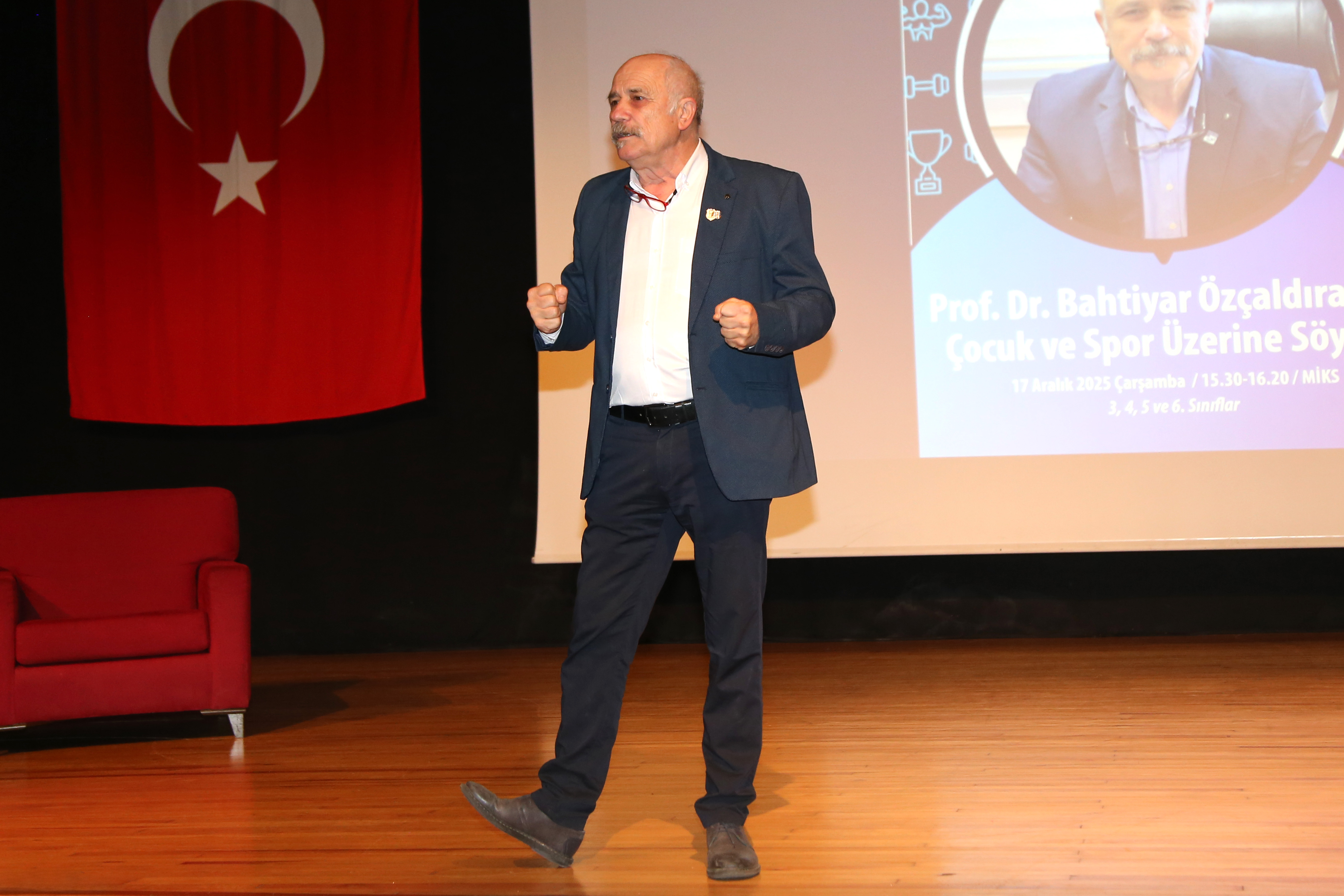 Antrenörlük Eğitimi Anabilim Dalı’nda 40 yılı aşkın süredir yürüttüğü çalışmalarıyla pek çok kıymetli antrenör yetiştiren Prof. Dr. Bahtiyar Özçaldıran’ı okulumuzda ağırladık. İlkokul ve ortaokul öğrencilerimizle “Spor ve Çocuk” başlıklı söyleşide bir araya gelen Prof. Dr. Özçaldıran; sağlıklı bir zihin ve bedene sahip olmanın temel unsurlarına değinirken, Türkiye’nin önde gelen sporcularının antrenman süreçlerinden ve başarılı bir sporcu olmanın gerekliliklerinden örnekler paylaştı. Bu değerli söyleşi, öğrencilerimizin spora bilinçli bir bakış açısı kazanmalarına katkı sağlarken, okulumuzun çocukların fiziksel, zihinsel ve sosyal gelişimini bütüncül bir yaklaşımla destekleme vizyonunu da güçlendirdi.