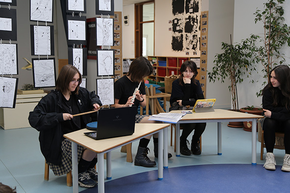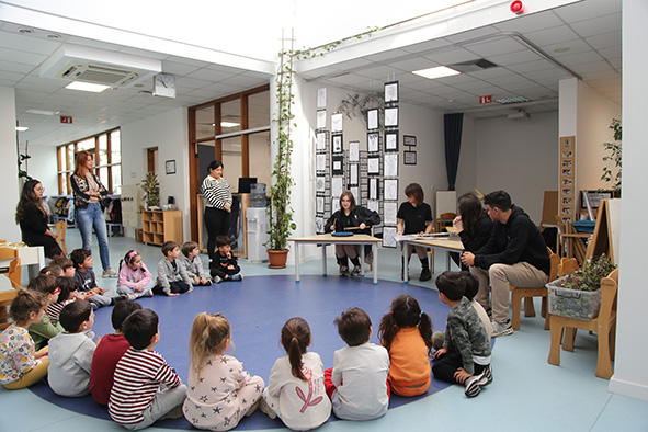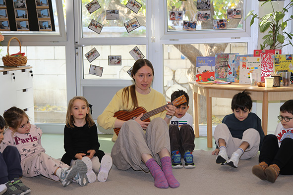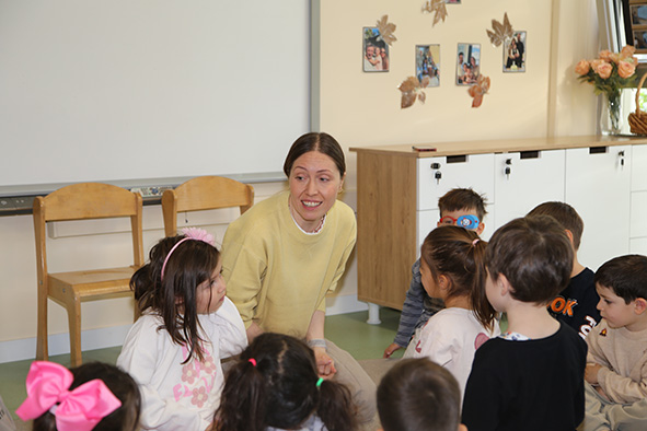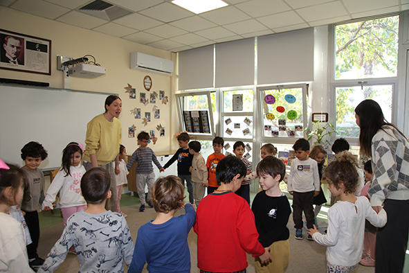 Anaokulu öğrencilerimiz, “Sanat, duygu ve düşüncelerimizi yaratıcı bir şekilde ifade etme yollarından biridir” ana fikri doğrultusunda yürütülen sorgulama sürecinde, sanatın farklı biçimlerini iki farklı atölye ile yakından tanıma fırsatı buldu. Lise öğrencilerimiz okulumuzu ziyaret ederek resim, müzik ve dans sanatları üzerine hazırladıkları sunumları okul öncesi öğrencilerimizle paylaştı. Büyük öğrencilerimizin kendi öğrenmelerini küçük yaştaki öğrencilerle paylaşması, sanata olan ilgiyi artırırken aynı zamanda akran etkileşimi yoluyla öğrenmeyi de destekledi. Sanat yolculuğumuz, Müzik öğretmeni Ezgi Tatar'ın, modern dans sanatına yönelik eğlenceli ve etkileşimli bir sunumuyla devam etti. Ritim, hareket ve beden farkındalığı üzerinden ilerleyen bu çalışmada öğrencilerimiz, dansın da güçlü bir ifade biçimi olduğunu yaşayarak öğrendi. Sanatla iç içe geçen bu öğrenme süreci, çocuklarımızın estetik farkındalıklarını desteklerken yaratıcılıklarını ve kendilerini ifade etme becerilerini güçlendirdi.